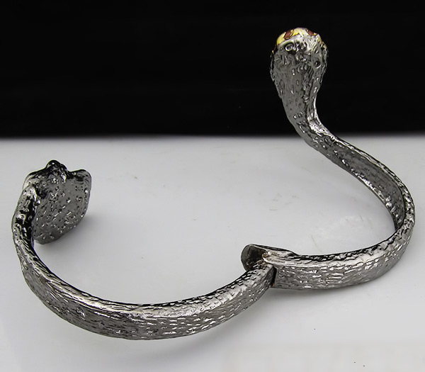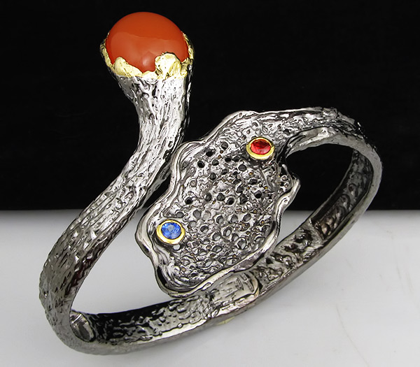 Браслет из черненого стерлингового серебра 925 пробы с корнелианом и сапфирами. Вес браслета — 47,6 гр. Площадка браслета — 66×53 мм. Выборочное золочение.