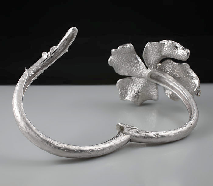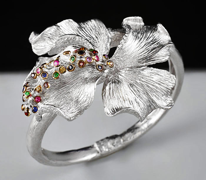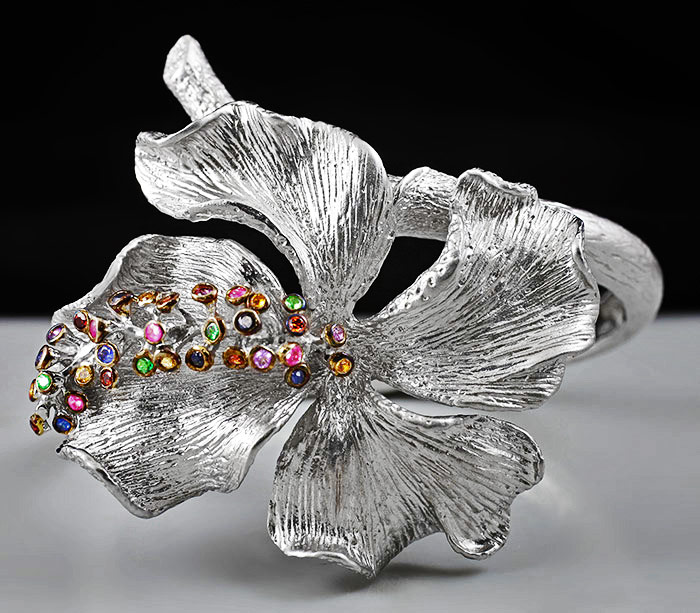 Браслет из текстурного стерлингового серебра 925 пробы с разноцветными сапфирами. Вес браслета — 50,7 гр. Площадка браслета — 55×54 мм. Выборочное золочение. В наличии браслет длиной 160 мм.