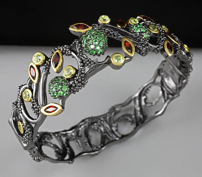 Браслет из черненого стерлингового серебра 925 пробы с перидотами, цаворитами и мозамбикскими гранатами. Вес браслета — 34,2 гр. Площадка браслета — 70×22 мм. Выборочное золочение.