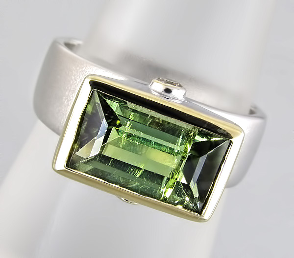 Кольцо из родированного стерлингового серебра 925 пробы с зеленым турмалином и 2 бриллиантами. Выборочное матирование. Оправа бриллиантов и декоративные элементы выполнены из золота 750 пробы. Размеры вставок 2 мм и 10×6 мм. Площадка 12×9 мм, высота 8 мм. Вес изделия 5,9 гр. Размер 17,25.