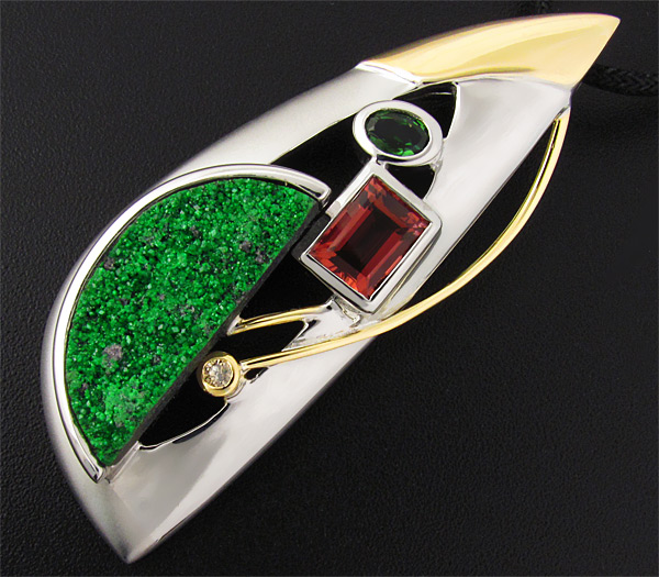 Кулон из стерлингового серебра 925 пробы с друзой агата изумрудного цвета, бриллиантом, зеленым и пурпурным турмалинами. Изделие частично матировано. Оправа бриллианта и декоративные элементы изделия выполнены из золота 585 пробы. Площадка кулона 58 х 23 мм. Вес 24,4 г. Ниже приводятся размеры вставок.