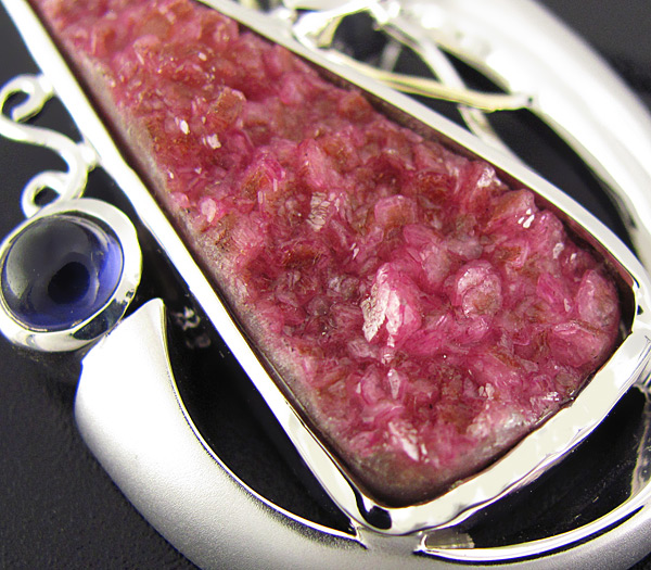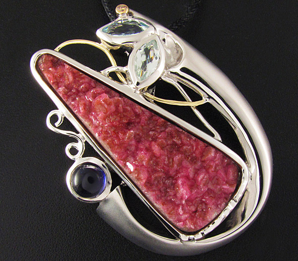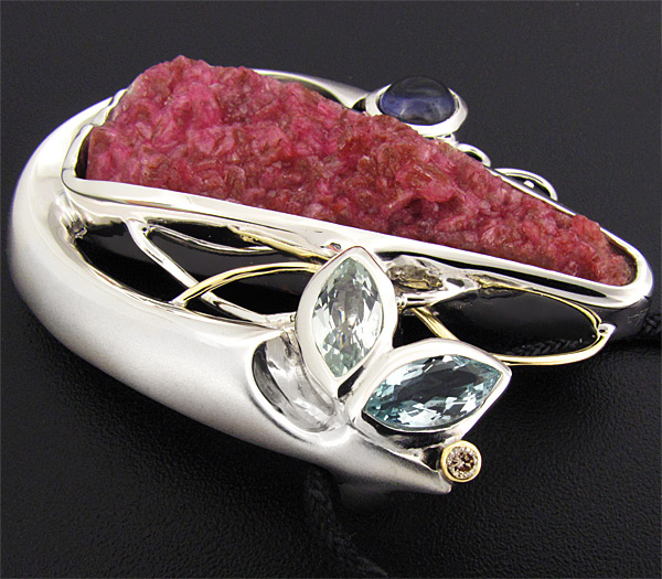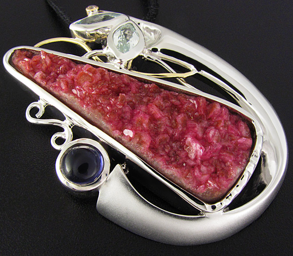 Кулон из стерлингового серебра 925 пробы с друзой родохрозита, аквамаринами, кабошоном иолита и бриллиантом. Изделие частично матировано. Оправа бриллианта и декоративные элементы изделия выполнены из золота 585 пробы. Площадка кулона 47 х 33 мм. Вес 24 г. Ниже приводятся размеры вставок.