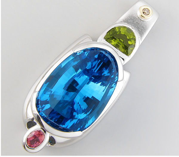 Кулон из стерлингового серебра 925 пробы с топазом авторской огранки, розовым и зеленым турмалинами, и бриллиантом. Изделие частично матировано. Оправа бриллианта выполнена из золота 750 пробы. Размеры вставок 2 мм и 18 х 13 мм. Площадка кулона 43 х 18 мм. Вес 18,7 г.