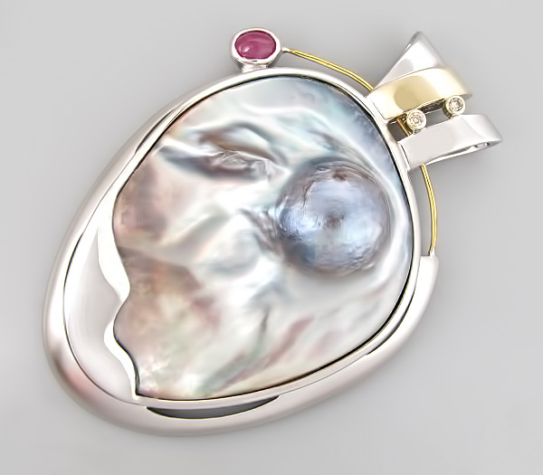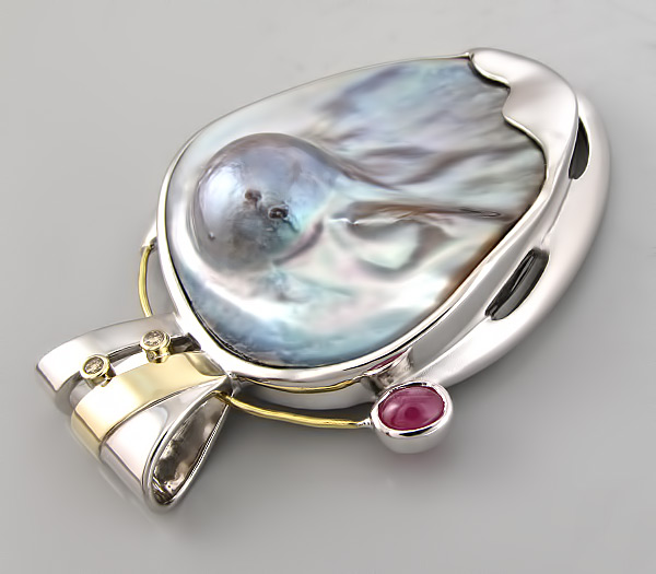 Кулон из стерлингового серебра 925 пробы с пузырчатым жемугом, кабошоном пурпурного сапфира и 2 брилллиантами. Изделие частично матировано. Оправа бриллиантов и декоративные элементы выполнены из золота 750 пробы. Размеры вставок от 2 мм до 42 х 33 мм. Площадка кулона 74 х 48 мм. Вес 47,4 г.