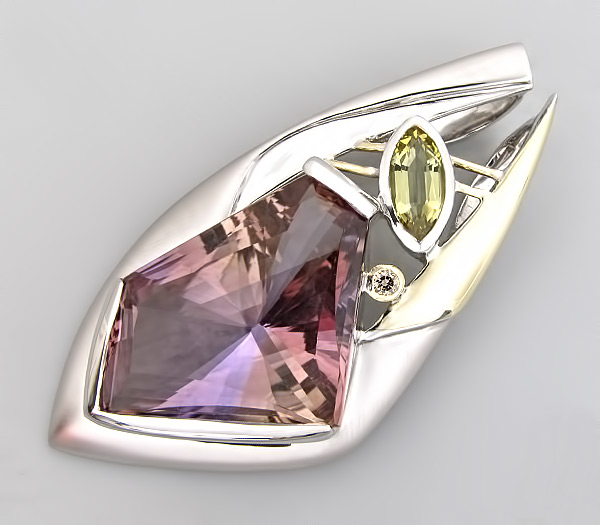 Кулон из стерлингового серебра 925 пробы с крупным аметрином авторской огранки, лимонным цитрином и бриллиантом. Изделие частично матировано. Оправа бриллианта и декоративные элементы выполнены из золота 750 пробы. Размеры вставок от 2 мм до 27 х 23 мм. Площадка кулона 58 х 29 мм. Вес 32,1 г.