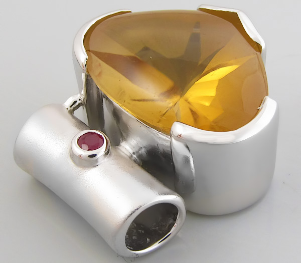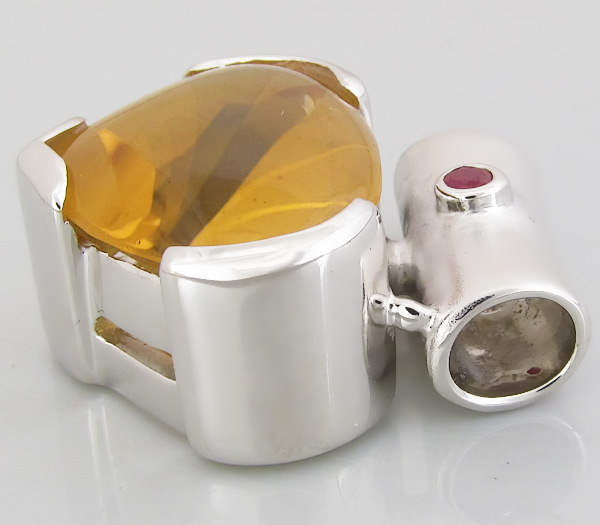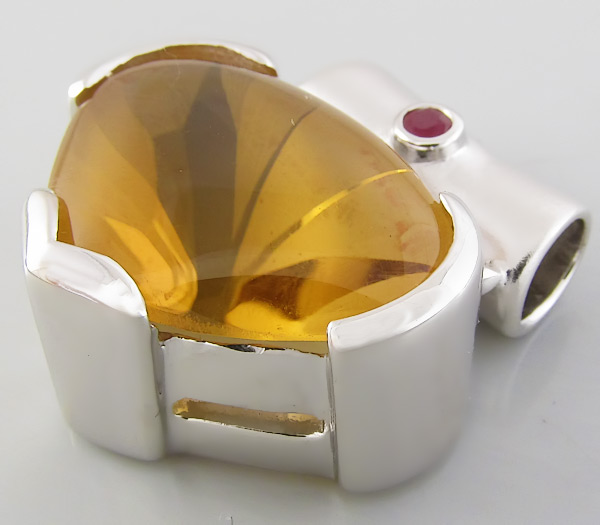 Кулон из стерлингового серебра 925 пробы с цитрином авторской огранки и сапфиром. Изделие частично матировано. Размеры вставок 2 мм и 21 х 16 мм. Площадка кулона 28 х 25 мм. Вес 18,9 г.