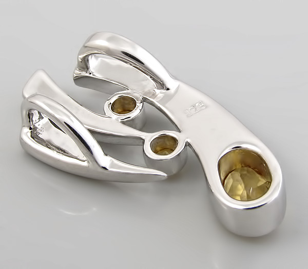 Кулон из родированного стерлингового серебра 925 пробы с золотистыми цитринами. Выборочное матирование. Размеры вставок 3 мм и 7×5 мм. Размеры кулона с петлей 31×15 мм. Вес 6,3 гр.