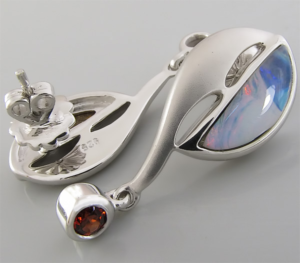 Серьги из стерлингового серебра 925 пробы с автралийскими болдер опалами и гранатами. Изделие частично матировано. Размеры вставок от 4 мм до 15 х 5 мм. Площадка серег 35 х 14 мм. Вес пары 12,6 г.