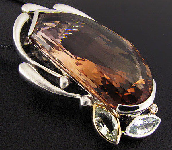 Вашему вниманию предлагается кулон из стерлингового серебра (925 проба) с крупным аметрином авторской огранки, аквамаринами и бриллиантом! Оправа бриллианта и аквамарина выполнены из золота 585 пробы. Площадка кулона 48 х 27 мм. Вес 23,2 г. Ниже приводятся размеры вставок.