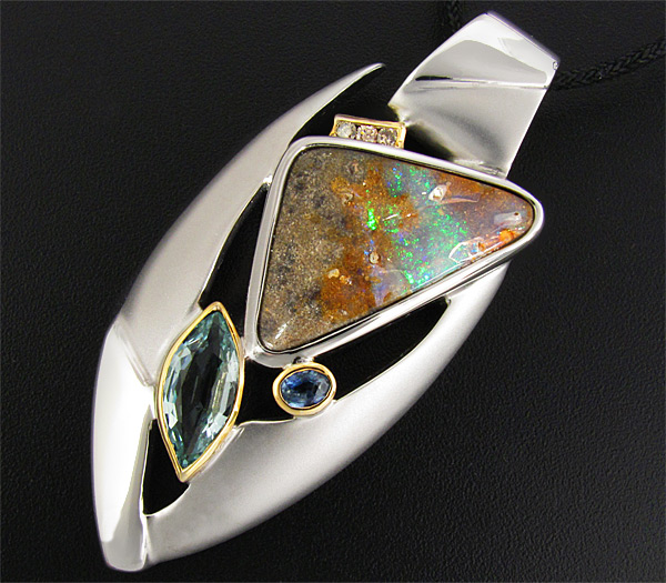 Вашему вниманию предлагается кулон из стерлингового серебра (925 проба) с эффектным болдер опалом, аквамарином, чистым синим сапфиром и тремя бриллиантами! Цвет опалесценции болдер опала: желтый/синий/зеленый/пурпурный. Изделие частично матировано. Оправа бриллиантов, аквамарина и сапфира выполнены из золота 585 пробы. Площадка кулона 59 х 26 мм. Вес 23,1 г. Ниже приводятся размеры вставок.