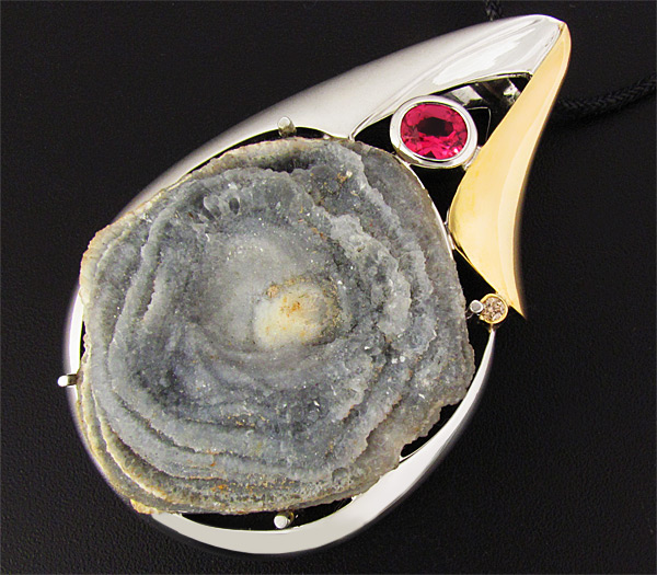 Вашему вниманию предлагается кулон из стерлингового серебра (925 проба) с друзой агата, ярким пурпурным рубеллитом турмалином и бриллиантом! Изделие частично матировано и позолочено. Оправа бриллианта выполнена из золота 585 пробы. Площадка кулона 58 х 37 мм. Вес 33,3 г. Ниже приводятся размеры вставок.