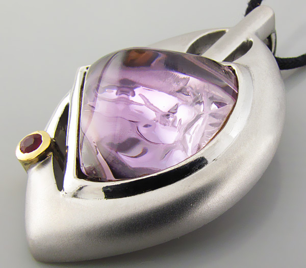 Вашему вниманию предлагается стильный кулон из стерлингового серебра (925 проба) с аметистом авторской огранки и пурпурным сапфиром! Оправа сапфира выполнена из золота 585 пробы. На тыльной поверхности аметиста вырезана голова лошади. Площадка кулона 42 х 27 мм. Вес 18,8 г. Ниже приводятся размеры вставок.