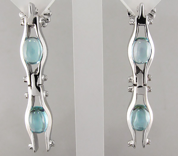 Вашему вниманию предлагаются экстравагантные серьги из стерлингового серебра (925 проба) с кабошонами светло-голубых топазов! Размеры вставок 7 х 5 мм. Площадка серег 41 х 8 мм. Вес пары 13,3 г.