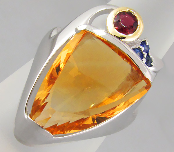 Вашему вниманию предлагается кольцо из стерлингового серебра (925 проба) с крупным золотистым цитрином авторской огранки, родолитом гранатом и тремя синими сапфирами! Изделие частично позолочено. Площадка 27 х 14 мм, высота 11 мм. Вес изделия 11 г. Размер 17,25. Ниже приводятся размеры вставок.