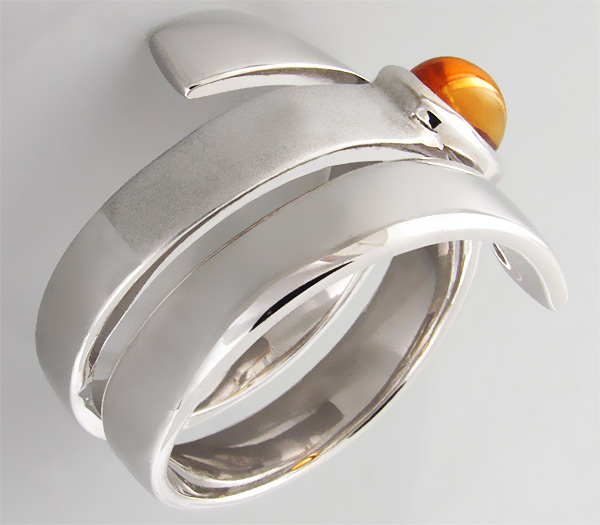 Вашему вниманию предлагается кольцо-спираль из стерлингового серебра (925 проба) с кабошоном золотистого цитрина! Размеры вставки 7 х 5 мм. Ширина площадки 17 мм, высота 6 мм. Вес изделия 10,6 г. Размер 20.