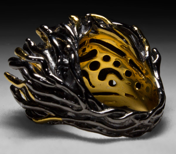 Кольцо из черненого стерлингового серебра 925 пробы с зеленым агатом (кабошон 12×8 мм) и синими сапфирами. Общая масса вставок 7,4 карат. Выборочное золочение. Площадка кольца — 35×22 мм, высота — 9 мм. Вес изделия — 23,9 гр.