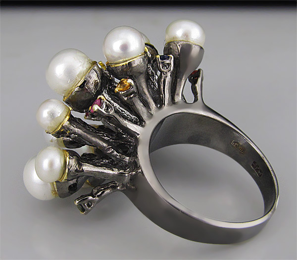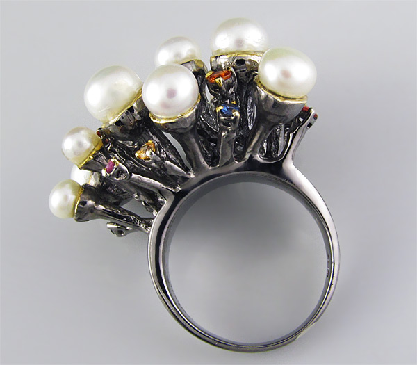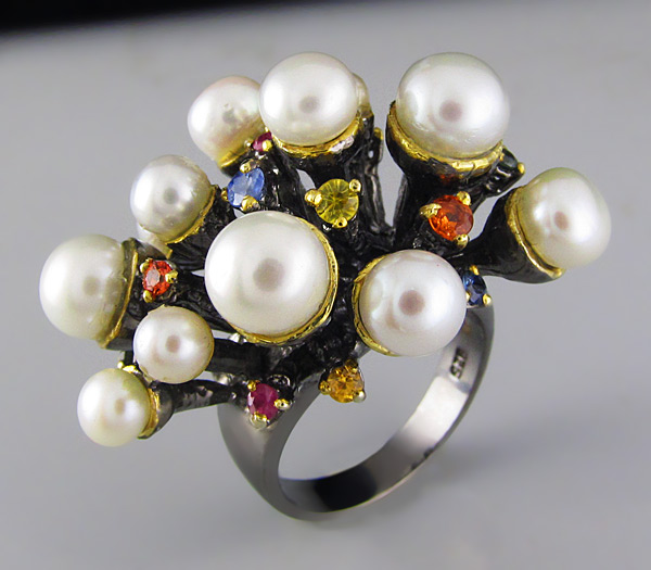 Кольцо из черненого стерлингового серебра 925 пробы с жемчугом (3–5 мм) и разноцветными сапфирами. Выборочное золочение. Площадка кольца — 34×24 мм. Вес — 18,8 гр.