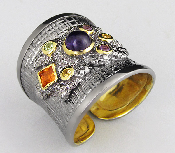 Кольцо из черненого стерлингового серебра 925 пробы с аметистом (кабошон 5 мм) и самоцветами. Выборочное золочение. Вес — 13,3 гр. Площадка — 24×22 мм.