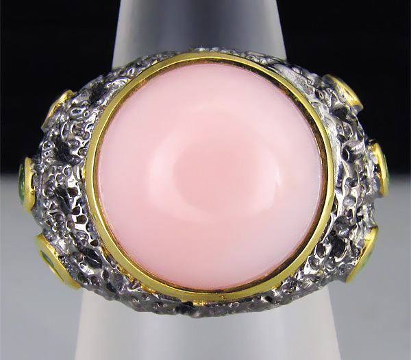 Кольцо из черненого стерлингового серебра 925 пробы с крупным розовым опалом и цаворитами. Выборочное золочение. Вес — 10,2 гр. Площадка кольца — 24×17 мм.