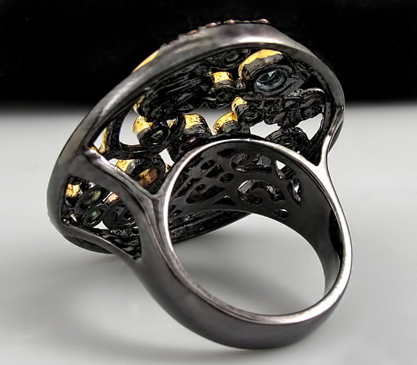 Кольцо из черненого стерлингового серебра 925 пробы с турмалином, цитрином, топазом, цаворитами гранатами и сапфирами. Выборочное золочение. Вес — 14,4 гр. Размер площадки — 32×32 мм.
