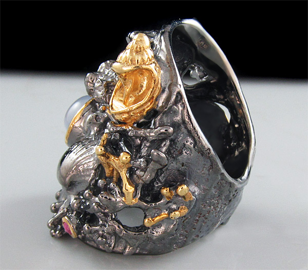 Кольцо из стерлингового черненого серебра 925 пробы с халцедоном (кабошон 8 мм), зеленым агатом и розовым кварцем. Выборочное золочение. Вес — 24,6 гр. Размер площадки — 35×24 мм.