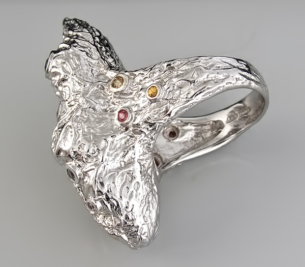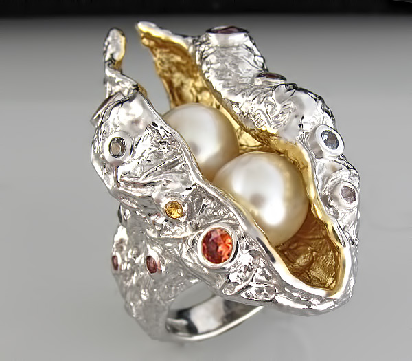 Кольцо из стерлингового родированного серебра 925 пробы с подвижным жемчугом, разноцветными сапфирами и родолитами гранатами. Выборочное золочение. Вес — 22,8 гр. Размер площадки — 40×20 мм.