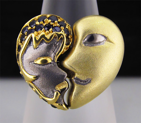 Составное кольцо из черненого стерлингового серебра 925 пробы с черными шпинелями. Вес кольца — 7,1 гр. Площадка кольца — 21×18 мм. Выборочное золочение и матирование.