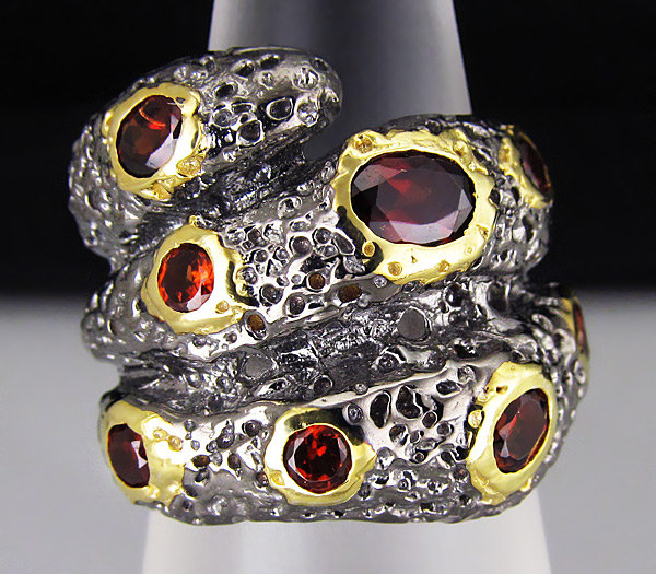 Кольцо из черненого стерлингового серебра 925 пробы с гранатами. Вес кольца — 12,4 гр. Площадка кольца — 24×22 мм. Выборочное золочение.