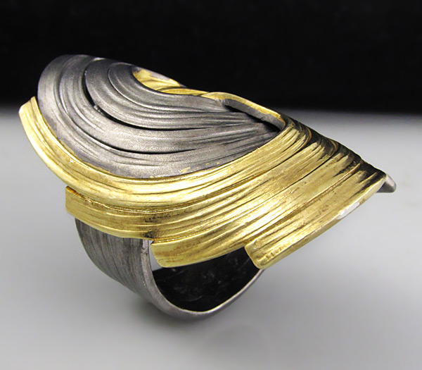 Кольцо из черненого стерлингового серебра 925 пробы. Вес кольца — 17,6 гр. Площадка кольца — 38×23 мм. Выборочное золочение и матирование.