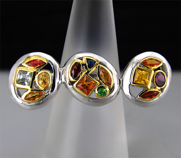 Кольцо из стерлингового серебра 925 пробы с разноцветными сапфирами, цаворитами, родолитами и мозамбикскими гранатами. Вес кольца — 8,6 гр. Площадка кольца — 38×14 мм. Выборочное золочение.