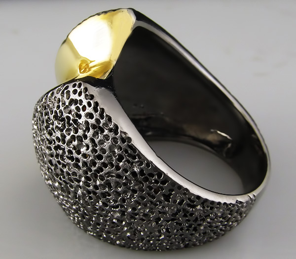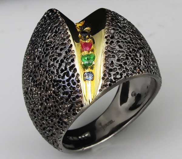 Кольцо из черненого стерлингового серебра 925 пробы с цаворитом гранатом и сапфирами. Вес кольца — 11,1 гр. Площадка кольца — 23×22 мм. Выборочное золочение.