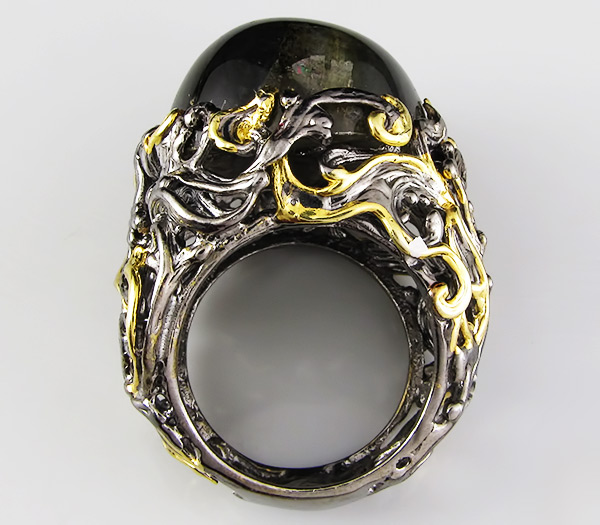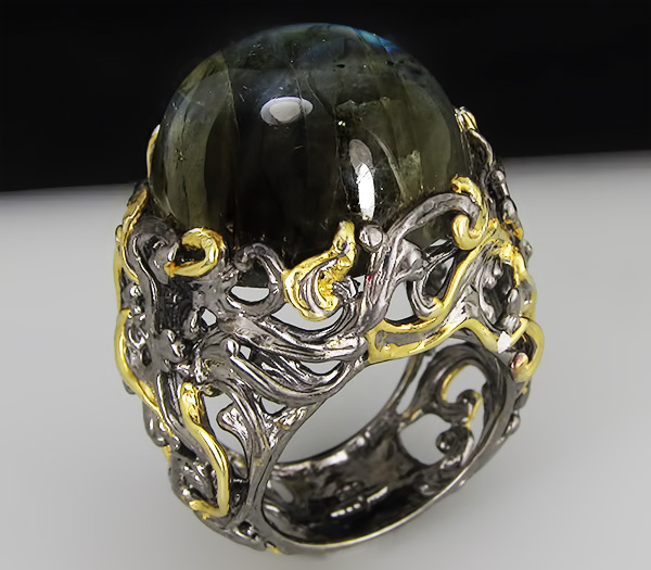Кольцо из черненого стерлингового серебра 925 пробы с лабрадоритом. Вес кольца — 19,9 гр. Площадка кольца — 28×24 мм. Выборочное золочение.