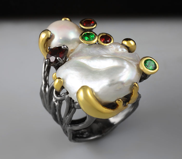 Кольцо из черненого стерлингового серебра 925 пробы с жемчугом, цаворитами и мозамбикскими гранатами. Вес кольца — 17,2 гр. Площадка кольца — 33×22 мм. Выборочные золочение и матирование.