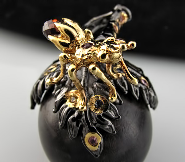 Скульптурный кулон из черненого стерлингового серебра 925 пробы с сапфирами и шара из экзотического дерева Sono (25 мм). Вес — 10,46 гр. Размер кулона — 45×25 мм. Мини-скульптура муравья позолочена.