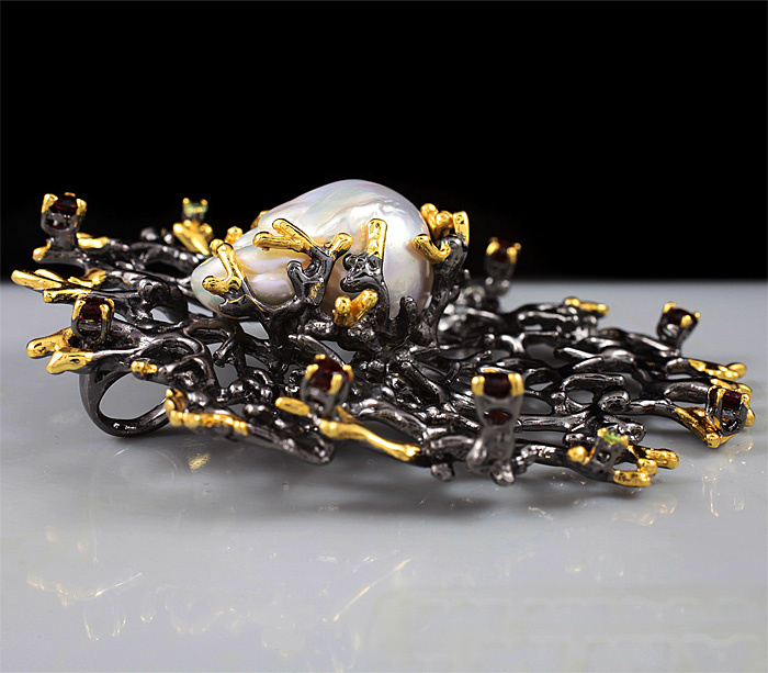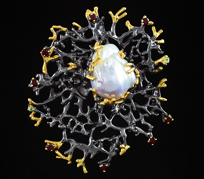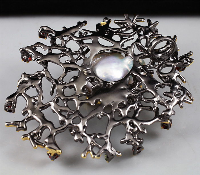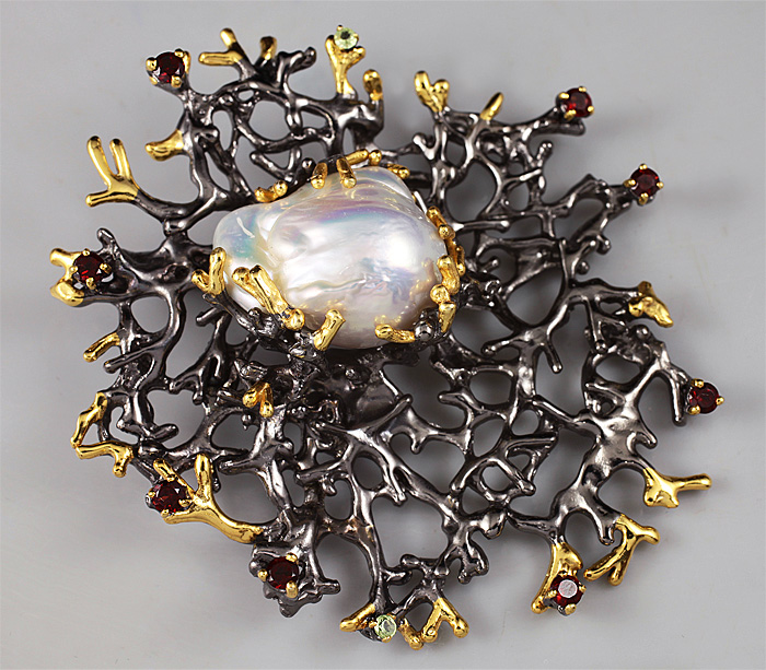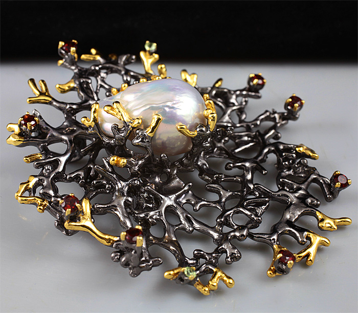 Кулон из черненного стерлингового серебра 925 пробы с жемчужиной (20×13 мм), гранатами и перидотами. Вес — 39,62 гр. Размер кулона — 66×60 мм. Выборочное золочение.