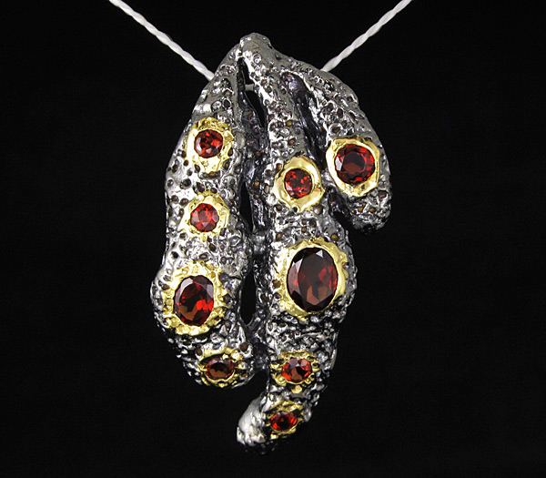 Кулон из черненого стерлингового серебра 925 пробы с гранатами. Вес — 13,5 гр. Размер кулона — 44×24 мм. Выборочное золочение.