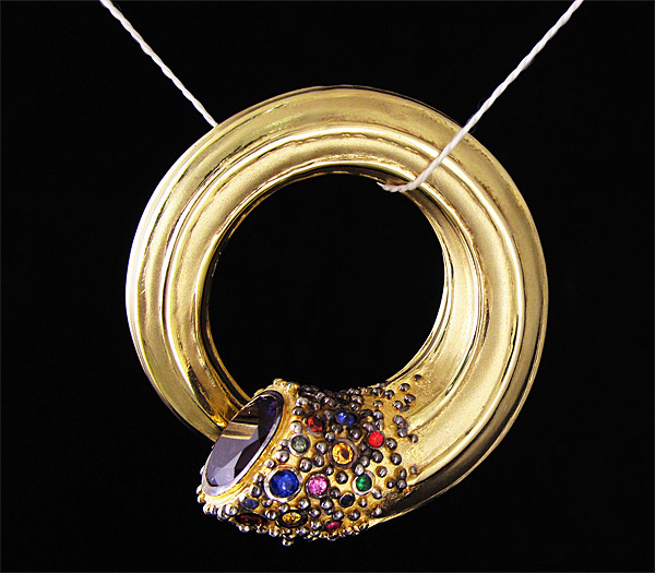 Кулон из позолоченного стерлингового серебра 925 пробы с аметистом, цаворитами гранатами и сапфирами. Вес 41,3 гр. Размер кулона — 48×45 мм. Выборочное чернение.