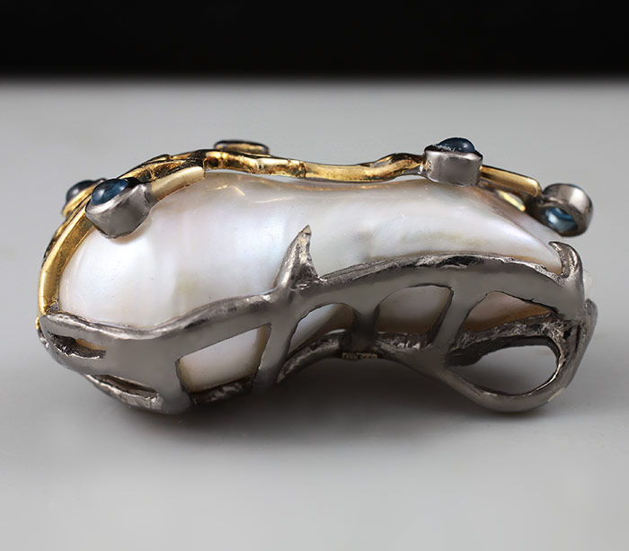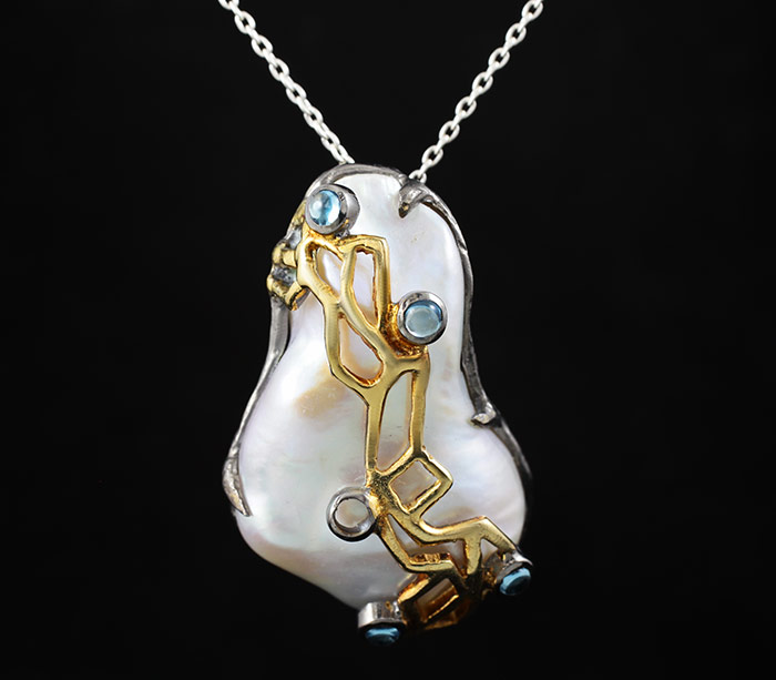 Кулон из черненого стерлингового серебра 925 пробы с жемчугом барокко и топазами. Вес — 14,2 гр. Размер кулона — 33×22 мм. Выборочное золочение