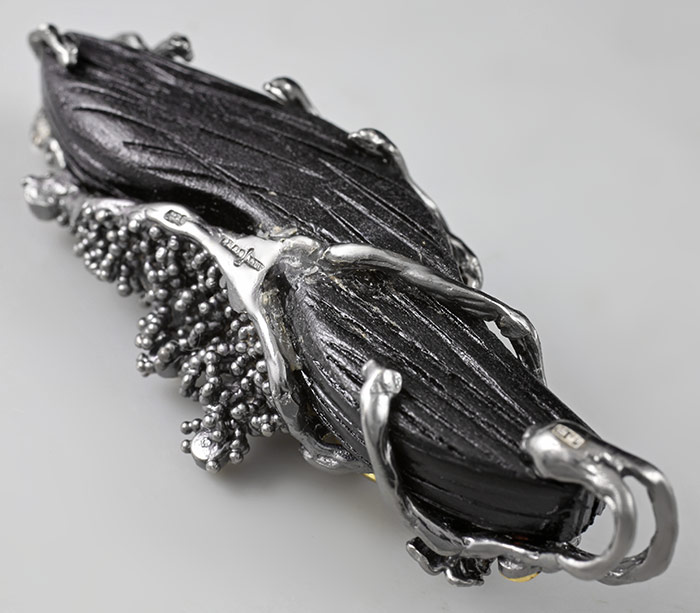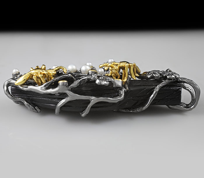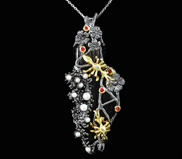 Кулон из черненого стерлингового серебра 925 пробы с черным деревом Sono, жемчугом и оранжевыми сапфирами. Вес — 18,6 гр. Размер кулона — 67×27 мм. Выборочное золочение.