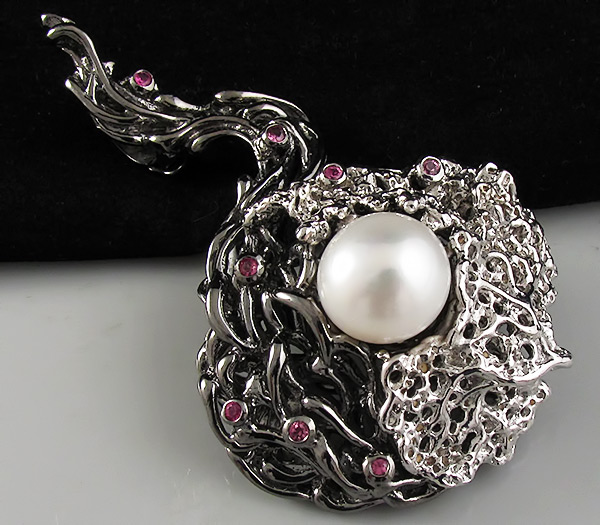 Брошь/кулон из родированного и черненого стерлингового серебра 925 пробы с жемчужиной (13мм) и розовыми сапфирами. Вес — 34,67 гр. Размер броши — 68×39 мм.