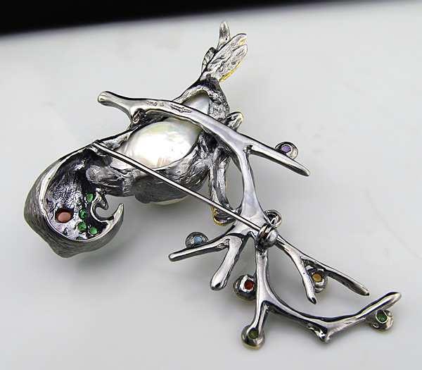 Брошь из черненого стерлингового серебра 925 пробы с жемчужиной, мозамбикским и цаворитами гранатами, аметистом, топазом, перидотом и сапфирами. Вес — 32,6 гр. Размер кулона — 71×63 мм. Выборочное золочение.