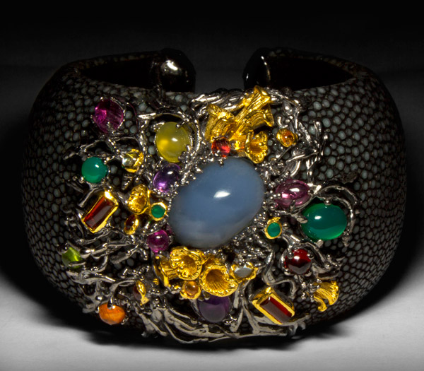 Браслет из стерлингового серебра 925 пробы с кожей ската, аметистами, агатами, топазами, разноцветными турмалинами, цитринами, халцедоном кабошоном (19×13 мм), родолитами, спесартинами и родолитами гранатами. Площадка браслета 76 х 53 мм. Вес браслета — 114 гр. Выборочное золочение.