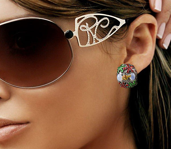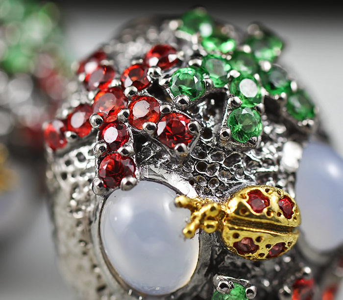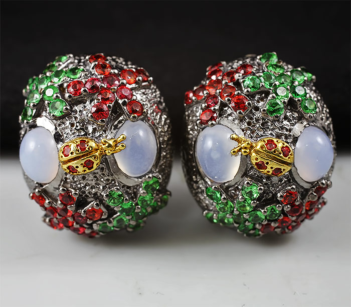 Серьги из серебра 925 пробы с халцедоном и самоцветами.Серебро 925, Золочение, Чернение Инкрустация: Сапфир, Халцедон, Цаворит гранат Вес изделия: 17,1 грамм Размер: 23×19 мм