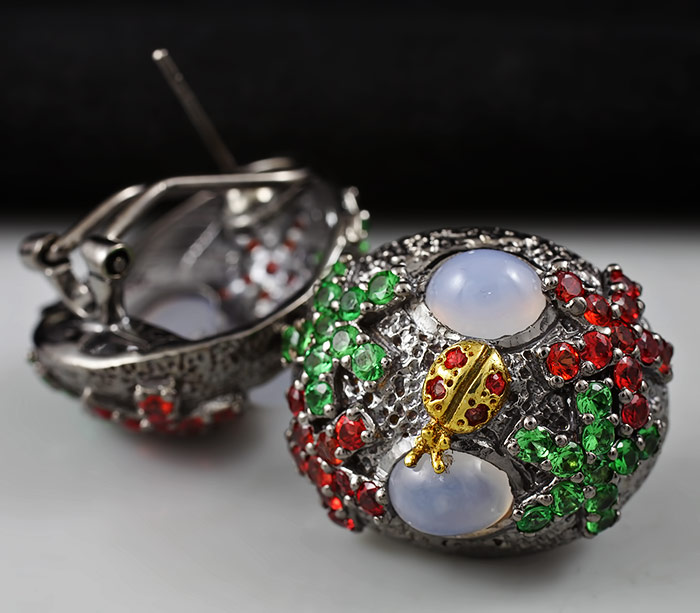 Серьги из черненого стерлингового серебра 925 пробы с халцедоном и самоцветами. Размер серег — 23×19 мм. Вес — 17,1 гр.