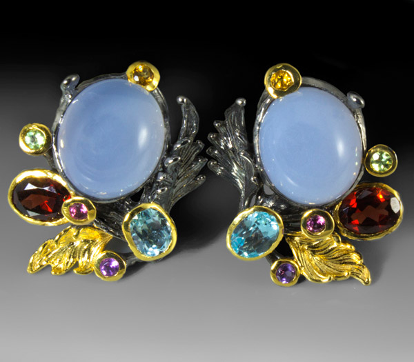 Серьги из черненого стерлингового серебра 925 пробы с крупными халцедонами (кабошоны 13×9 мм) и самоцветами. Выборочное золочение. Вес — 18,6 гр. Размер серег — 28×26 мм.
