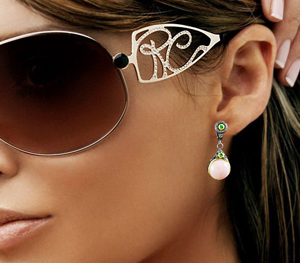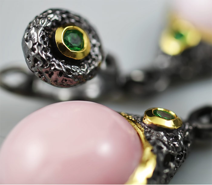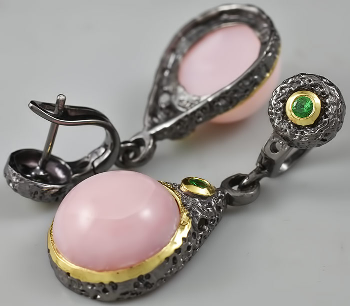 Серьги из черненого стерлингового серебра 925 пробы с крупными розовыми опалами и цаворитами. Выборочное золочение. Вес — 9,5 гр. Размер серег — 34×14 мм.