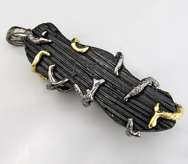 Кулон из дерева Sono и черненого стерлингового серебра 925 пробы с цитрином (10×7мм), аметистами, сапфирами и топазом. Вес — 12,56 гр. Размер кулона — 70×22 мм. Выборочное золочение.