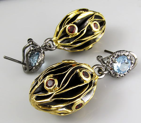 Серьги из черненого стерлингового серебра 925 пробы с топазами и гранатами. Вес — 20,3 гр. Размер серег — 39×16 мм. Выборочное золочение.
