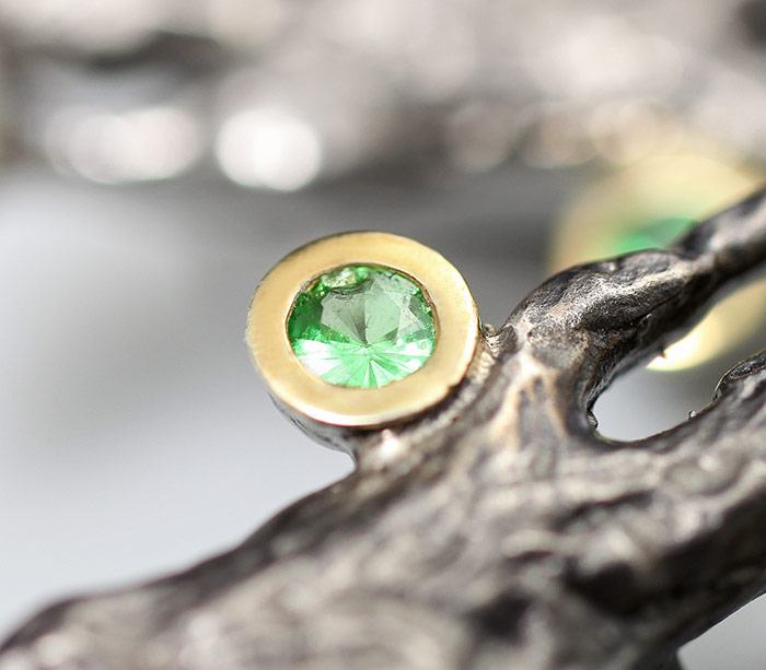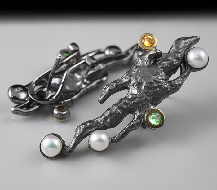 Серьги из черненого стерлингового серебра 925 пробы с жемчугом, цаворитами гранатами и золотистыми сапфирами. Вес — 12,5 гр. Размер серег — 41×17 мм. Выборочное золочение и матирование.