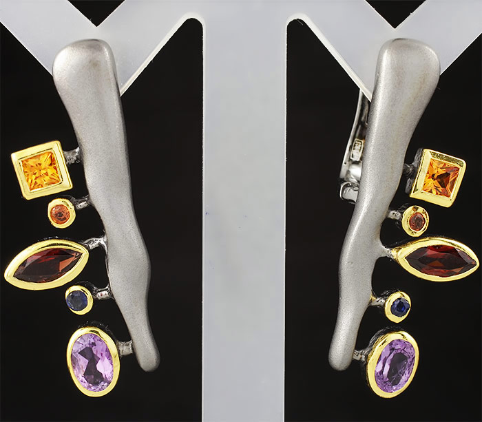Серьги из черненого стерлингового серебра 925 пробы с разноцветными сапфирами, гранатами и аметистами. Вес — 8,3 гр. Размер серег — 33×14 мм. Выборочное золочение и матирование.